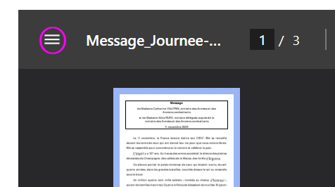 (Pour avoir le texte en pleine page, cliquez sur les 3 traits, au dessus à gauche de l’aperçu des pages pour faire disparaitre le menu)